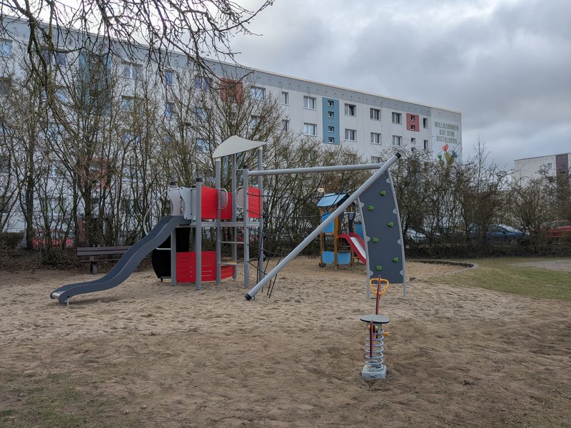 Ausstattung: drehbare Seilpyramide, Sandspielturm mit Rutsche für kleinere Kinder bis 6 Jahre, Spielgerät mit Rutsche für Kinder von 6 bis etwa 12 Jahre, Wipptier, Jugendhütte, Jugendtreff, 2 Kleinfeldtore, 1 Basketballkorb