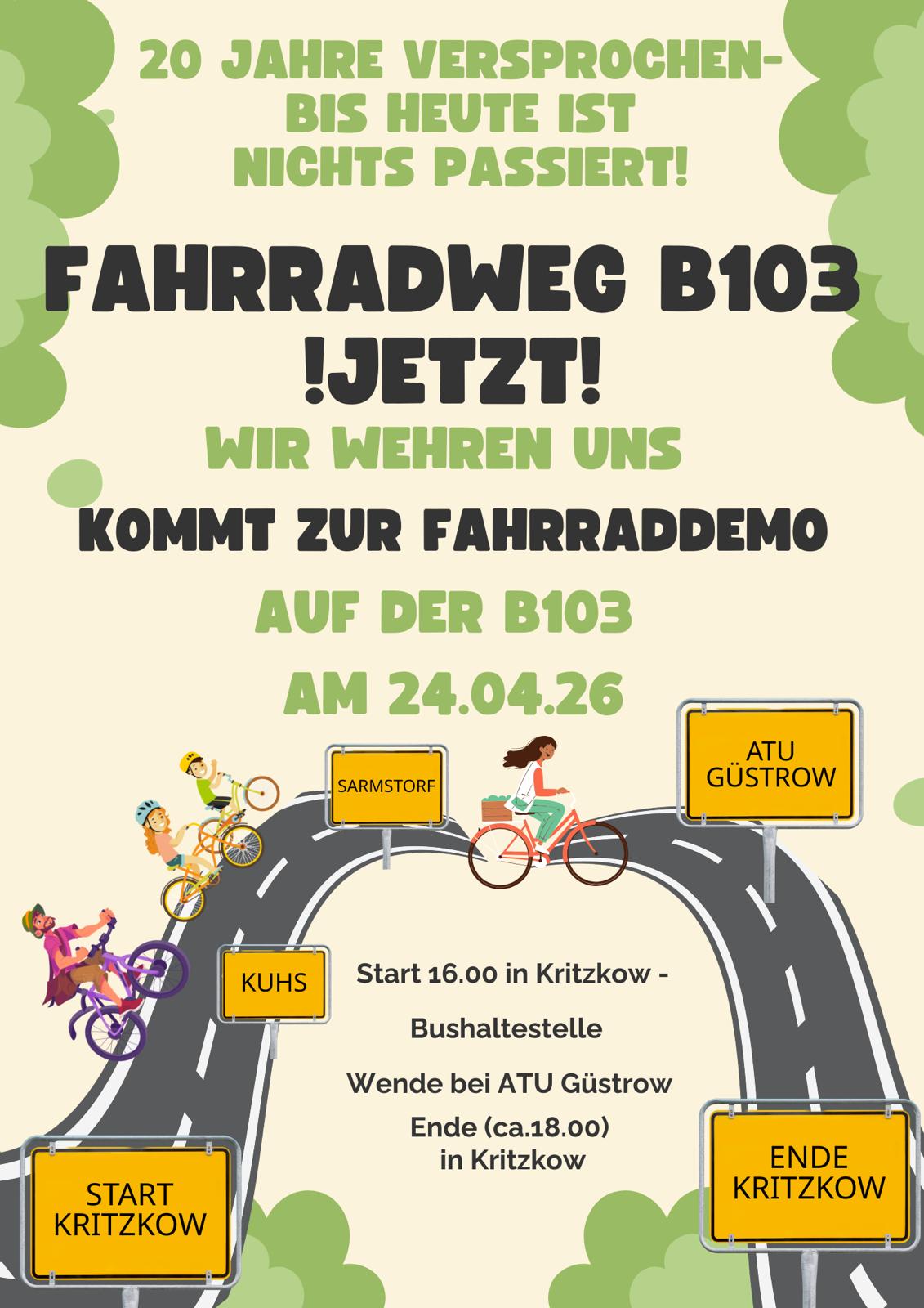 • Demonstration für Radweg an B103 von Güstrow nach Kritzkow am 24.04.2026